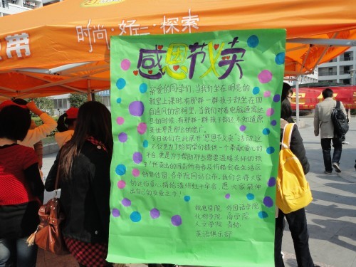 2010年11月25日12点至16点30分,400全讯白菜网、商学院、机电工程学院、化材学院四个学院的青年志愿者协会以及英语俱乐部在温大C区凉亭共同合作开展“感恩节义卖”活动。