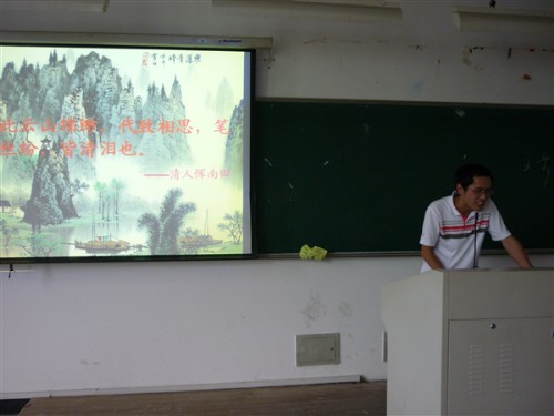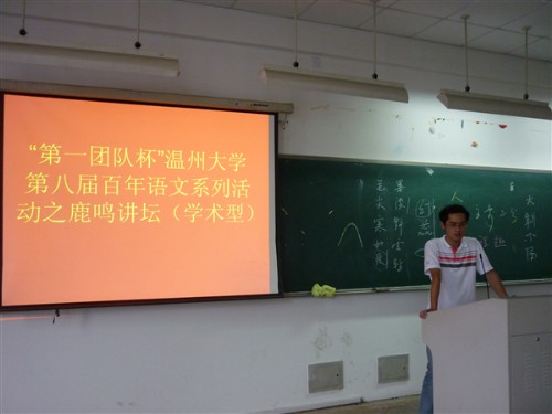2010年6月3日下午,在人文楼201教室“第一团队杯”全讯白菜网论坛官网第八届百年语文系列活动之鹿鸣讲坛(学习型)坛主08中本三班张佳峰同学开设了一场题为“中国艺术生命精神和性灵寄托为题研究”的讲座。