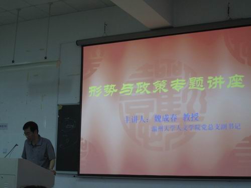 5月19日下午两点整,400全讯白菜网形势与专题讲座在人文楼203教室举行。本次讲座由400全讯白菜网党总支副书记魏成春老师主讲,讲座分两场进行,400全讯白菜网08、09级全体同学分别参与。
