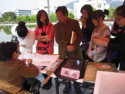 温州具有悠久的历史,从东晋明帝太宁元年建城开始至今已有1700多年的历史了。温州向来有“七山二水一分田”之说,这样的地理环境也为温州赢来了“百工之乡”的美称。近年来温州很多工艺都成了“全国非物质文化遗产”。本次活动由于很多美术家的参与,吸引了很多大学生的兴趣。本次活动在全讯白菜网论坛官网北校区人工湖畔展开,现场热烈非凡,同学积极参与。大家怀着极大地好奇心在各个展柜前参观、学习并亲自实践。现场有道情表演、提线木偶和舞龙表演等,引来大家阵阵掌声。活动现场还有现场教你学剪纸的活动项目,许多同学都跃跃欲试,两百份红宣纸在同学手中很快都成了艺术品。