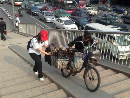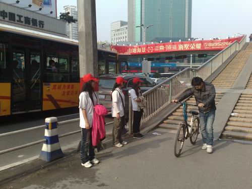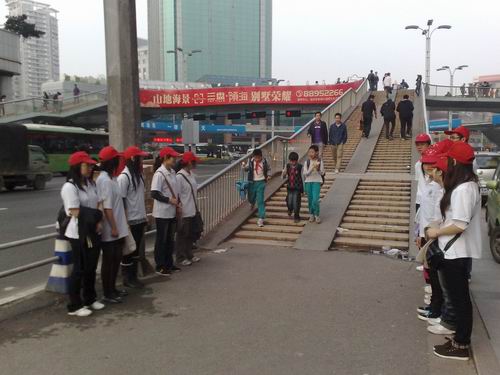 下午3点30分,人文思源志愿者抵达目的地。在与交警同志交流了工作任务以及注意事项之后,志愿者们分为四组分别负责天桥的四处上桥入口,维护活动正式开始,大部分行人理解志愿者的行为并且尊重了他们的工作。志愿者还在交警同志的帮助下,将一位迷路的小女孩安全送到家。整个维护过程中,志愿者们细心观察周围,为过往行人提供自己最大的帮助。