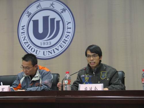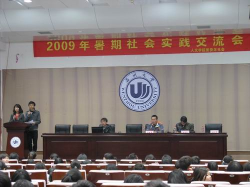 在观看了一段“教育时空”有关温大400全讯白菜网2009年暑期社会实践的专题报道视频后,交流会正式开始。首先,麻法全老师向同学们介绍了2009年暑期社会实践活动的情况,并展示了各实践队的成果和心得感悟。而后,由主持人吴婕和院十佳歌手冠军郜波为大家带来优美的歌曲演唱《被风吹过的夏天》后,活动进入游戏环节。小游戏充分带动了在场同学的情绪,活动气氛渐渐热烈。接下来的交流活动以诗为名,别具一格。“小荷才露尖尖角”通过让大一同学对09社会实践图片的印象实践感悟和创意命名令同学们体会到了大学生对社会的责任感和关怀。“映日荷花别样红”的环节中,大一同学们尽情畅想将来暑期社会实践的计划,并由麻法全老师作出精彩的评点,提出中肯的建议。"道是无晴却有晴",各优秀暑期社会实践队的队长依次上台进行PPT成果展示,让大一同学感受到了真实的暑期社会实践生活。最后,冯建军老师和麻法全老师为本次活动作总结发言。