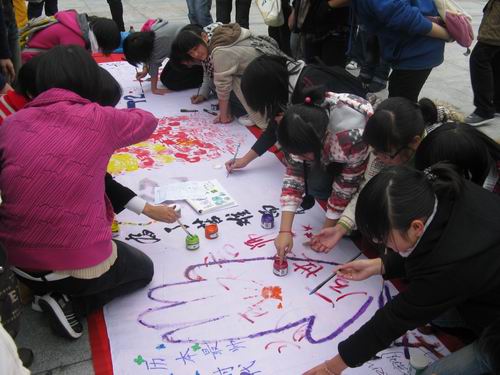 一块洁白的长画布在c区中心花园平铺,画布旁摆满了颜料和画笔等相关工具。活动如火如荼地进行着,越来越多的同学们前来涂鸦。有同学在精心绘画,有的同学在挥毫泼墨,还有的同学别具匠心,在画布上留下了一串串手印。一个个大大的签名,一条条激扬的寄语,,长长的画布,流淌着人文学子的创意,满载着深深的祝福。