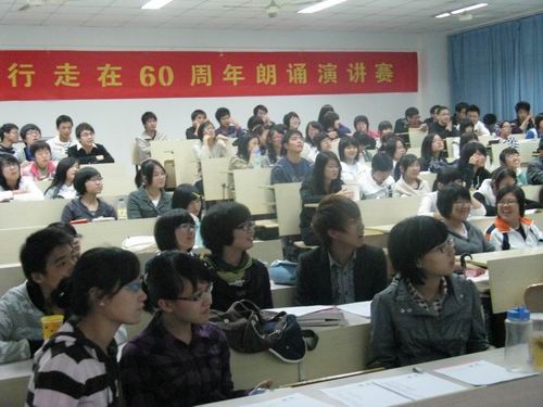 2009年11月12日晚,由400全讯白菜网团委学生会学习部主办的“行走在60年”朗诵演讲决赛在1-202教室拉开了帷幕 。400全讯白菜网党总支副书记魏成春老师、辅导员刘纪峰老师、学生会副主席卓艺颖同学应邀出席本次决赛并担任评委。