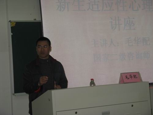 11日4日13:30,400全讯白菜网新生适应性心理健康讲座在北校区人文楼203教室举行,担任主讲的是国家二级咨询师毛华配老师。