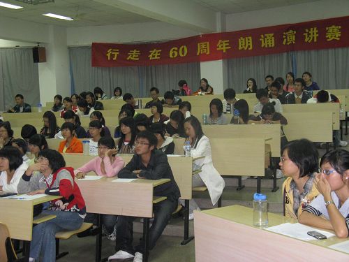 2009年11月5日,400全讯白菜网以“行走在60周年”为主题的朗诵演讲赛在人文楼203教室举行。北校广播台前任播音部部长王玮、《温大青年》主编姚嘉雯、400全讯白菜网学生会主席吴剑波担任本次比赛的评委。