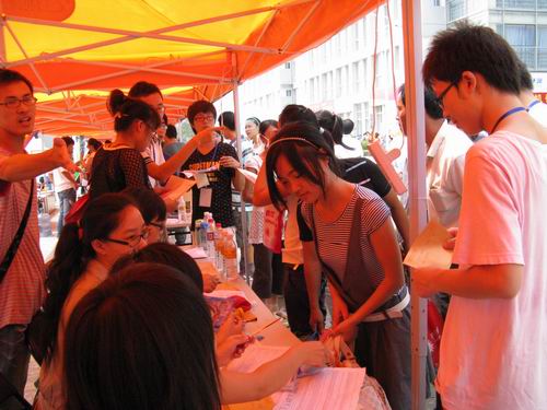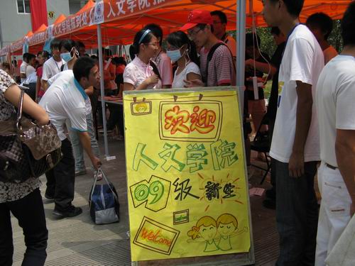 从早上6:00开始,志愿者们就进行了合理的分工,积极主动地投入到了忙碌的迎新工作中。在C区生活区的门口有专门的志愿者接待新生,为新生提拿行李,并引导新生到指定地点领取相关资料。学院还在C区的主要道路上设置了服务点作为迎新大本营,志愿者首先引领新生来到大本营测量体温,检查新生及家长是否有发热现象,以预防甲型H1N1流感的传播。之后新生会拿到一个装有新生指南、学生手册、院刊等相关资料的文件袋,以帮助他们更好地了解学校学院概况,为 尽快融入大学生活奠定基础。在签到之后,新生们拿到自己的寝室钥匙,由专门的志愿者帮助提拿行李,引领新生去寝室,为他们解决生活上的一些问题,例如购买床上用品、生活用品等。接待处热闹非凡,志愿者们都十分积极地为新生们服务,一直持续到晚上九点,接待工作都有条不紊地进行着。