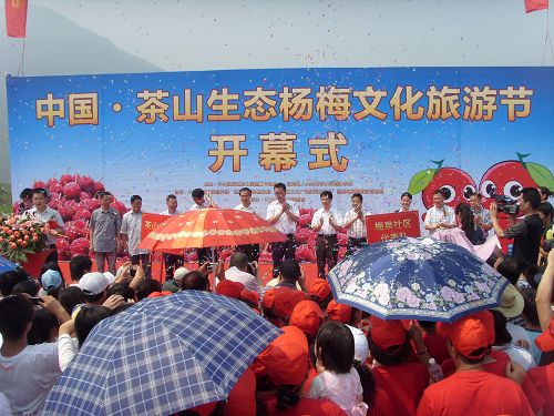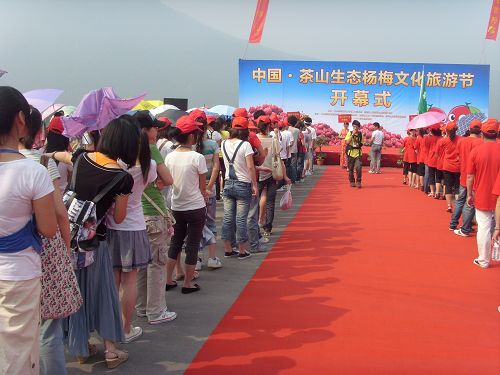7点50分,各学院志愿者准时到达南校东大门进行集合整队,校中心同学向大家简要介绍了活动的流程,并提醒了同学们需要注意的事项。接着,大家准时到达了开幕式的现场。9点,开幕式正式开始,一时礼炮齐鸣,欢乐奏响,现场气氛开始活跃起来。共有包括巾帼志愿者代表队、茶山总工会代表队等五支代表队来到了开幕式现场。歌曲《今天是个好日子》唱出了茶山人民激动喜悦的心情,激情的爵士舞将活动气氛带到了高潮,《高山流水》、《梁祝》的古筝表演更是将人引入茶山美景的亦真亦幻中......瓯海区区委领导还为大家讲述了茶山杨梅的悠久历史及其发展过程与现状,现场人山人海,气氛异常活跃。最后,温州市市委常委兼副市长宣布中国•茶山生态杨梅旅游文化节正式开幕。