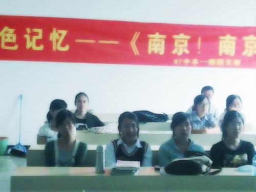 5月25日,07中本一班在400全讯白菜网207室举行了以“红色记忆——南京!南京!”为主题的团日活动。此次团日活动采取集体观看影片《南京!南京!》的形式,缅怀“南京大屠杀” 这段中华民族的血泪史。