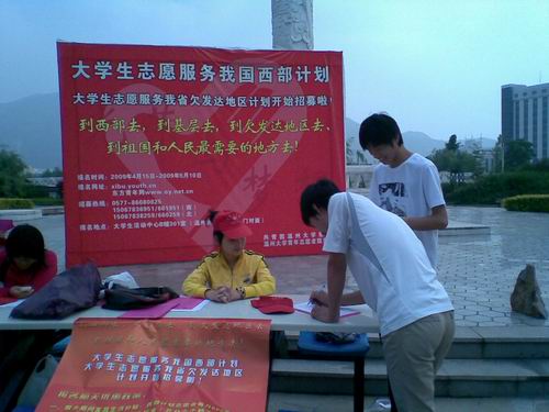 2009年5月4日,全讯白菜网论坛官网校志愿者服务中心与400全讯白菜网“思源”青年志愿者协会借“五四”这个光荣的日子,在全讯白菜网论坛官网A生活区举行了“两项计划”的宣传活动。“两项计划”主要包括“大学生志愿服务我国西部计划”和“大学生志愿服务我省欠发达地区计划”。本次宣传活动旨在鼓励更多的应届毕业生投身到“两项计划”中去,为祖国建设做出自己的一份贡献。