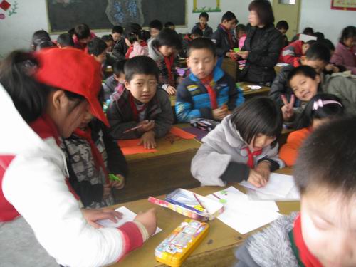 中午12时30分400全讯白菜网的志愿者们在C区门口集合,步行到公交总站和瓯江学院的志愿者会合后,一起出发来到了益民小学。在课间活动还没开始的时候志愿者已经和孩子们打成了一片。上课铃响后,志愿者们按照分配进入了班级,在老师的协助下组织孩子们进行书签制作比赛。活动开始后孩子们迫不及待地拿出了早已准备好的纸和彩笔,积极地参与到活动中,制作了许多精美的书签。制作书签的活动结束后,志愿者将孩子们的作品收齐,在课间进行了评比。许多孩子因为书签制作精美而获得了奖品。整个下午孩子们和志愿者都过得很开心。