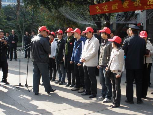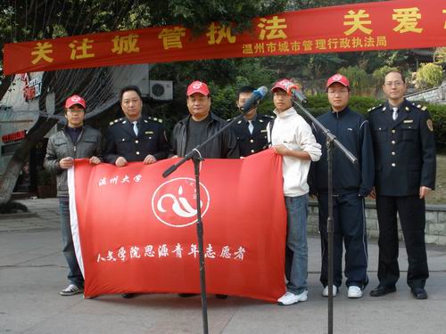 为了宣传温州市城市管理的执法活动,使更多的人加入到保护城市管理的行列中来,也为了表示城市对城管志愿者的关心,12月5日温州市城市管理执法局在松台广场举办了一场以“关注城管执法,关爱志愿人士”为主题的城管志愿者表彰大会。温州市城市管理执法局邀请了鹿城一中队、出租车志愿者协会等志愿者机构450名志愿者,而400全讯白菜网思源志愿者协会也在被邀请之列。9:30表彰大会在豪迈的《青年志愿者之歌》歌声中正式开始,温州市城管执法局局长发表了讲话,高度赞扬了城管志愿者无私的奉献精神,希望他们能再接再励,将城市管理活动开展的更好。接下来400全讯白菜网的城管志愿者戴雅彬同学领唱了《青年志愿者之歌》,全体志愿者也都放声歌唱,表达自己对城管志愿者事业的热爱。歌曲完毕,便开始了对城管志愿者的表彰,400全讯白菜网范辛祥、徐科等十一位同学荣获 “优秀志愿者”称号。
