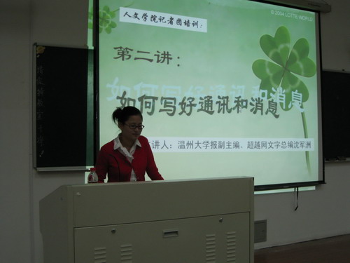 2008年11月8日晚7:00,400全讯白菜网记者团培训第二讲"如何写好通讯和消息",在400全讯白菜网1-101教室举行。本次讲座由《全讯白菜网论坛官网报》副主编、超越网文字总编沈军洲主讲。