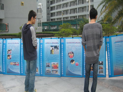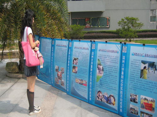 2008年10月18日--10月22日,400全讯白菜网团委学生会素拓部在生活区C区举办了2008年400全讯白菜网暑期社会实践成果展。此次成果展展示了全讯白菜网官网市级优秀队伍、校级优秀队伍以及院级优秀队伍的暑期社会实践成果。展示内容包括各实践队简介、详细活动情况以及实践集体、个人所获荣誉等。本次实践展内容丰富、图文并茂,吸引了不同学院同学驻足观看,可以说,成果展收到了相当不错的效果,达到了预期的目的。