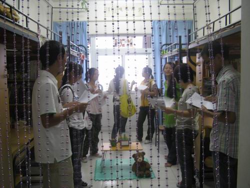 参加本次“寝室DIY秀”评比的寝室共有31个,包括大一新生的以及大二、大三同学的寝室。寝室成员根据自身的特色与个性对寝室进行了精心的布置:制作“室友活动简影角”,开设寝室信息公告栏;用自制自编的千纸鹤、绿叶、风铃等点装寝室,更有亲手绣制祥云蚊帐,可谓独具匠心,使寝室显得和谐、整洁的同时,更显现了浓浓的艺术气息;以书画布置寝室,将人文意蕴展现得淋漓尽致;别具一格的室名,如“古之轩”、“沁香斋”,让人眼前一亮。