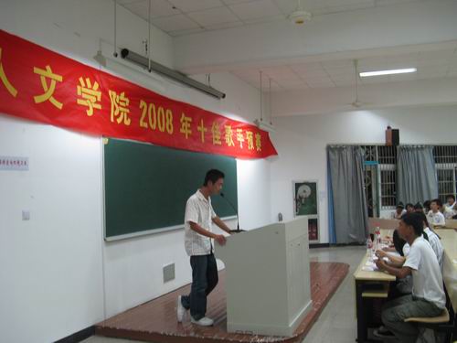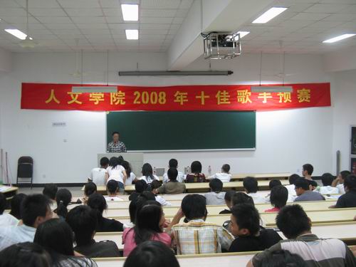 10月10日晚6:30,400全讯白菜网2008十佳歌手预赛在人文楼203教室如期举行。艺术团指导老师陈赛老师、全讯白菜网论坛官网十佳歌手张赟、400全讯白菜网十佳歌手王懿担任了本次预赛的评委,辅导员麻法全老师担任了本次比赛的嘉宾。