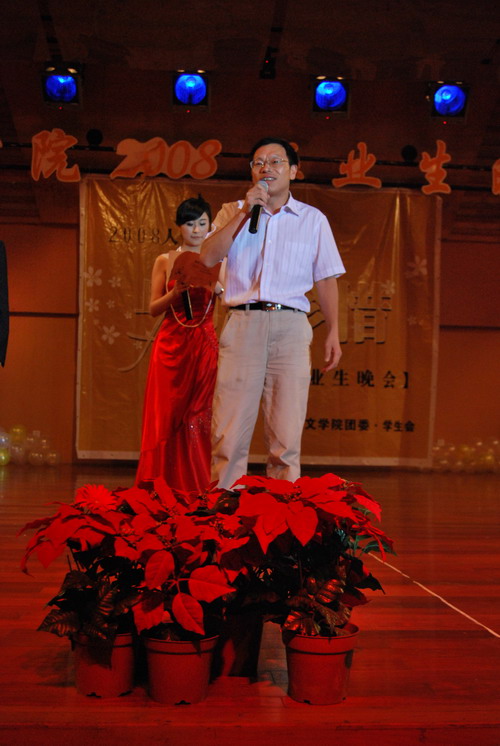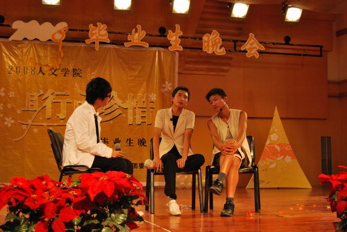 在的开场舞《Toc Toc Toc》动感十足的音乐和舞蹈中,本次晚会拉开了序幕。晚会分为走进校园、美丽成长和离别珍重三个部分。节目种类繁多,内容丰富,为在场的观众呈现上了一份视听盛宴。即将离校的大四学生则用自己十分的才情和对母校深切的情谊为这个离别的季节留下了最美的风景。张夏和辛颖这对老搭档为大家献上了一曲《老爹》,赢得了全场的掌声。而各届毕业生齐聚的《相聚2008》则将晚会推到了高潮。对于即将离校的学生,老师心中总是充满了不舍。因此毕业班的班主任们为大家带来了诗朗诵《生别离》《我希望》深深地打动了在场的观众。