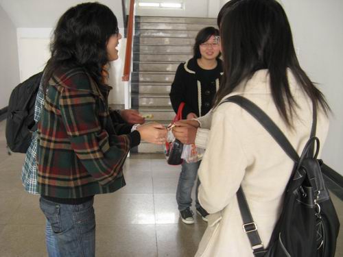 3月7日,400全讯白菜网团委学生会成员又在一号楼门口向学生"佳人"们赠送巧克力。巧克力虽小,但情意不淡。小小的巧克力载着400全讯白菜网团委学生会对同学满满的祝福。让所有佳人在属于她们自己的节日里,绽放出校园里最美丽的微笑,盛开出校园里最灿烂的鲜花。
