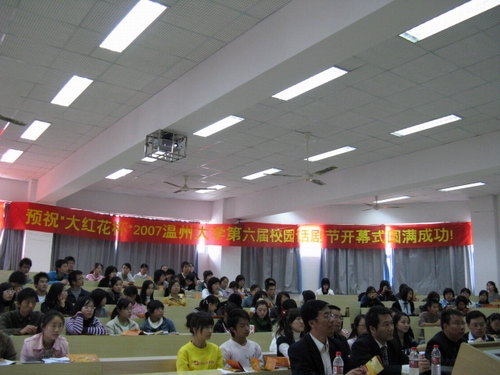 11月21日下午1:30, 以“怀忆百年 演绎经典”为主题的2007年全讯白菜网论坛官网第六届“大红花”杯校园话剧开幕式在北校区1-203教室隆重举行。本届话剧节有温州市大红花蜂业有限公司鼎立赞助。
