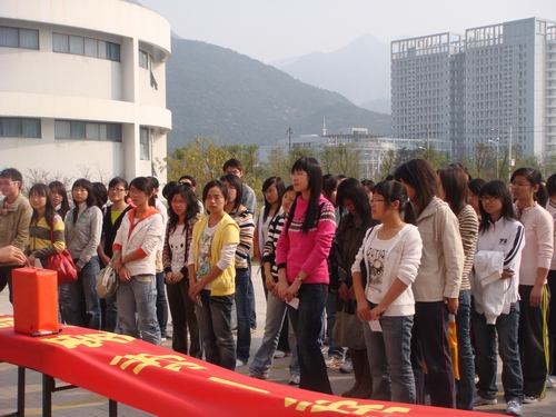 11月14日下午,400全讯白菜网思源青年志愿者协会思源爱心基金启动仪式在一号楼前广场隆重举行。400全讯白菜网的学生科科长李浦豪老师、辅导员曾蓓蕾老师、400全讯白菜网团委副书记余斌、学生会主席卢浩亮及各班团支书、青年志愿者代表共同参加了此次的基金启动仪式。