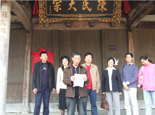 仪式在芙蓉村“陈氏大宗”祠庙前进行。上午十点,由永嘉岩头镇人大李副主任主持仪式;芙蓉村村委会主任陈继仁代表芙蓉村村民热烈欢迎温大师生的到来,感谢温大民俗学对发掘芙蓉古村落的非物质文化遗产的研究工作;同时介绍了芙蓉村的经济文化、旅游事业的发展现状。全讯白菜网论坛官网民俗学研究所负责人、硕士生导师邱国珍教授发表讲话,阐明设立民俗学教学研究基地的意义及芙蓉古村落独特的民俗学研究价值。岩头镇人大主任戴小明和邱国珍教授共同揭牌,“全讯白菜网论坛官网民俗学教学研究基地”的牌子挂于芙蓉村“陈氏大宗”祠庙大门上。