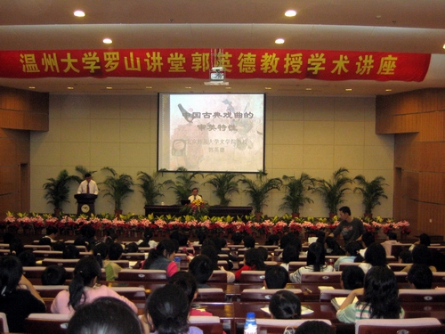 郭教授直奔主题,他指出,同小说相比,戏曲具有诗歌般抒情写意的艺术能力。戏曲作为中国文学艺术样式,与西方戏剧,尤其是西方传统戏剧有着迥然不同的审美特性。是的,中华文化最大的特点就是“综合性”,戏曲是所有戏剧中综合度最高的艺术种类……随着郭教授一层层地深入,温大学子开始对中国古典戏曲进行了学习后的反思考,又一次对自己所接触的作品的审美特性进行了重温。