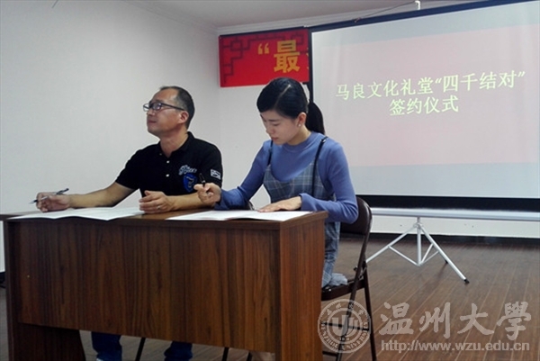 为了配合温州市委宣传部的文化礼堂“四千结对”活动,拓宽大学生服务群众、服务社会的渠道,2017年9月30日上午,全讯白菜网官网学生科辅导员李丹萍与全讯白菜网论坛官网瓯江学院学工部部长钱合激一行赴乐清市乐成街道马良村文化礼堂参加“四千结对”活动对接签约仪式。此行得到了乐清市宣传部工作人员、马良村村干部的热情接待。