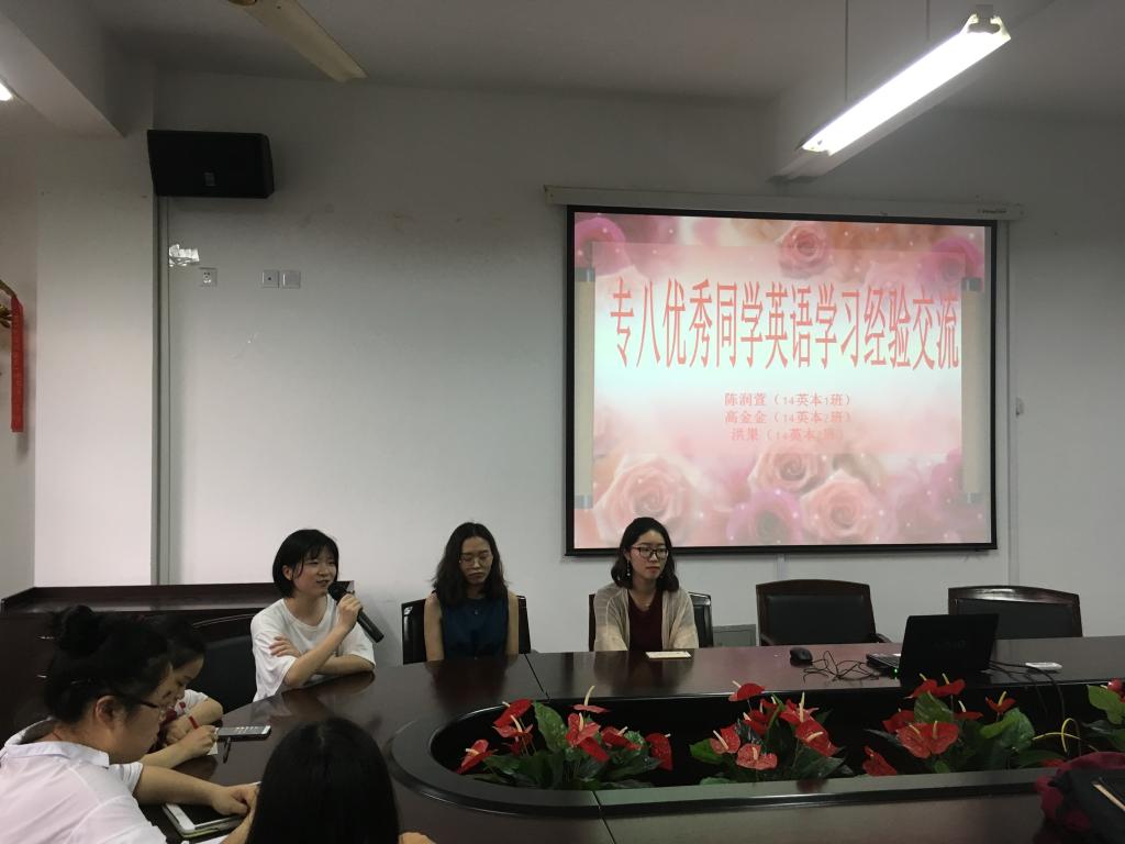 2018年6月19日晚,在外语楼212教室,全讯白菜网官网外语系和翻译系举行2018年第8场“外语类专业专四专八辅导讲座”,讲座邀请了全讯白菜网官网2018年专八成绩优秀的陈润萱(14英本1班)同学、洪果(14英本2班)同学和高金金(14英本2班)同学与大家交流英语学习经验。会议由外语系主任杨开泛博士主持。