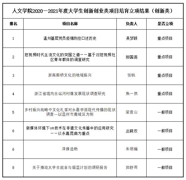 为进一步规范管理400全讯白菜网大学生创新创业类培育项目,根据《关于印发<400全讯白菜网大学生创新创业类培育项目管理办法>的通知 》[人文(2020)14号]文件要求,400全讯白菜网组织专家对各申报项目进行评审,经公示,共立项重点项目5项,一般项目5项,现将名单予以公布。