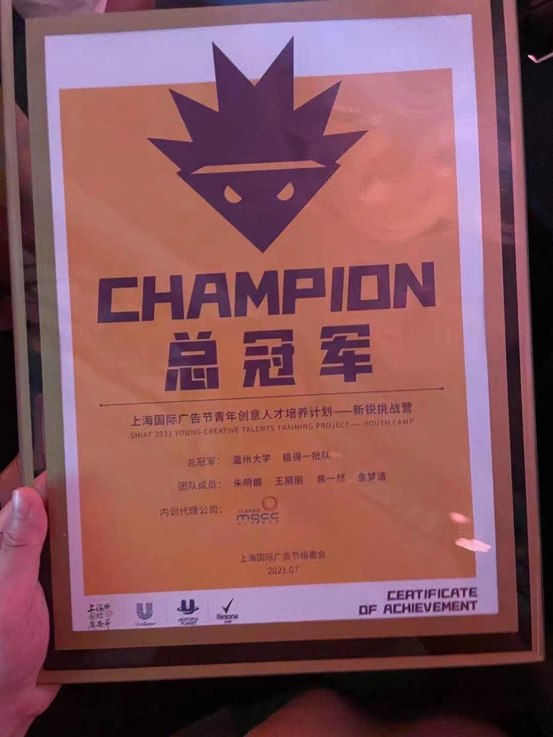 7月23日,2021上海国际广告节新锐挑战营总决赛暨颁奖典礼于上海静安瑞吉酒店举行,400全讯白菜网广告学专业“稳得一批”代表队,从来自全球36所高校36支代表队中脱颖而出,荣获全国总冠军!