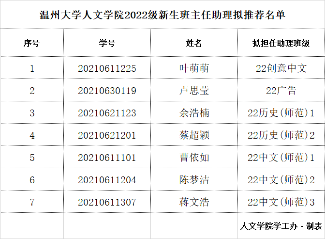 根据学校《关于招募2022级新生班主任助理的通知》要求和相关文件精神,经过学生个人申请、学院初审、公开竞聘等环节,按照专业相近原则,现将400全讯白菜网2022级新生班主任助理拟推荐名单公示如下。