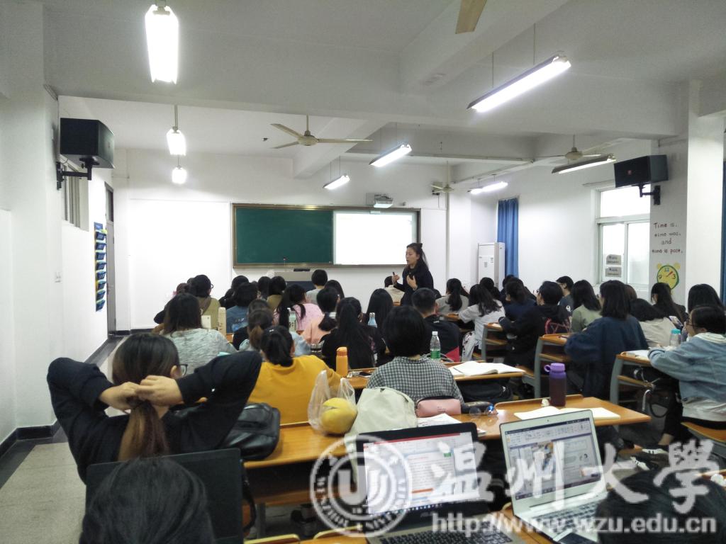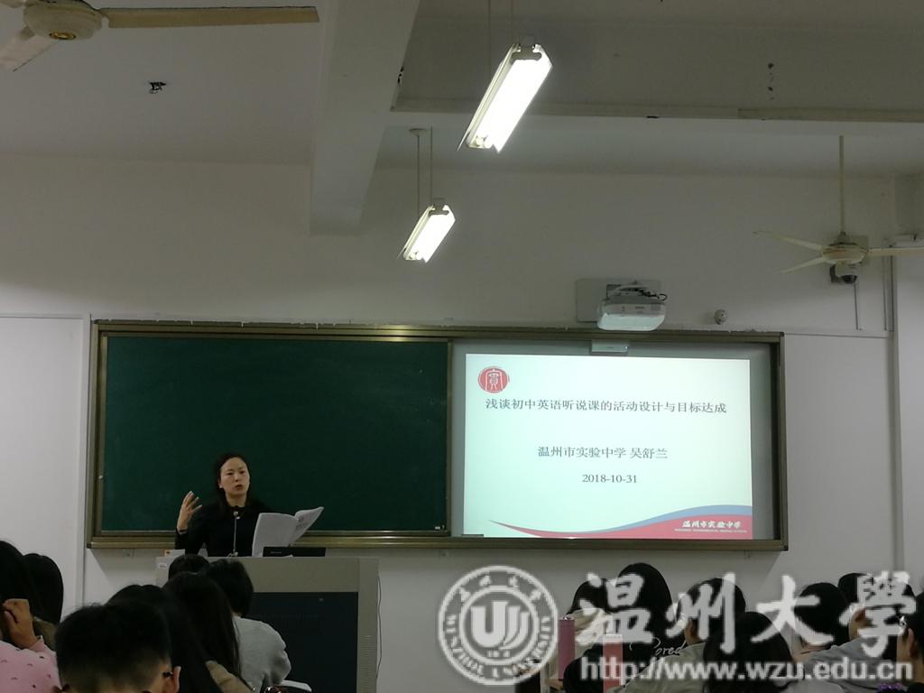 10月31日下午两点,外语楼210教室,400全讯白菜网邀请温州实验中学的名师吴舒兰为全讯白菜网官网16英语师范班举行“浅谈初中英语听说课的活动设计与目标达成”的讲座。吴舒兰老师,曾获浙江省优质课一等奖等多项荣誉。