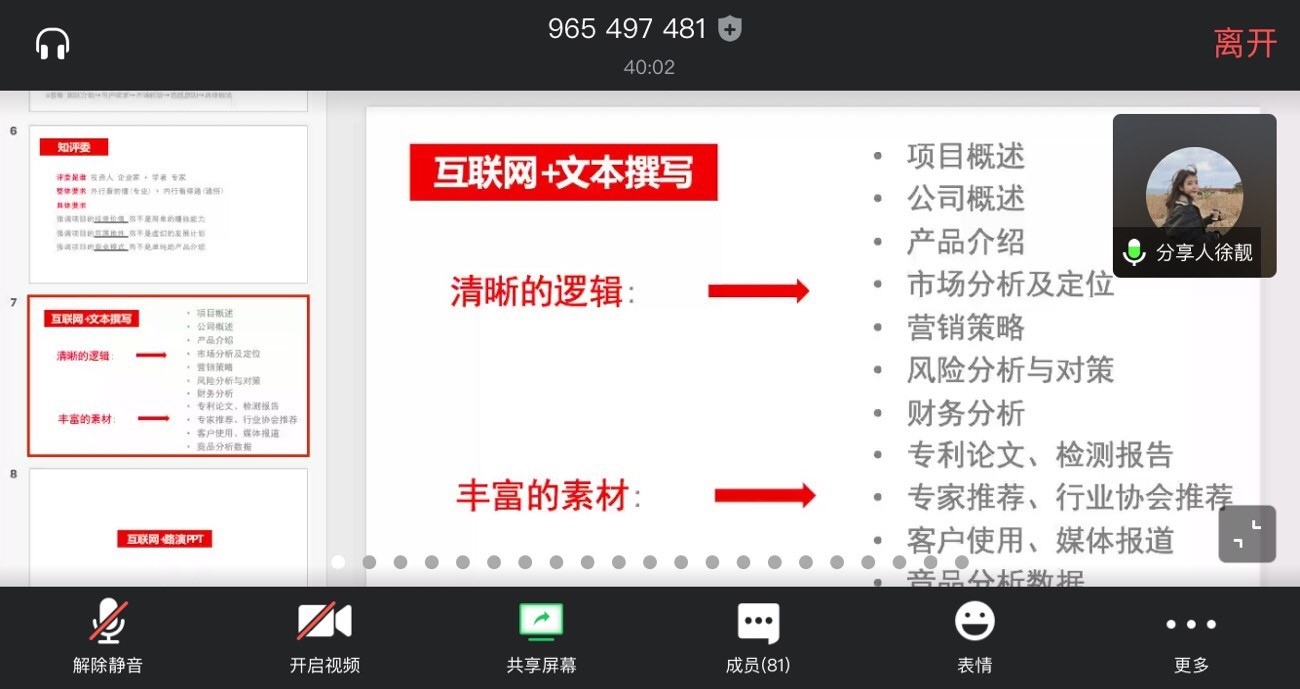 随后,会议进入经验分享环节。全讯白菜网官网16广告的徐靓首先进行分享,她详细介绍了“互联网+”大赛的具体概念,并就项目类型、项目设置做出了具体讲解。她强调在赛应前力求做到“知赛事”、“知作品”、“知评委”,不打没准备的仗。同时,她也为同学们讲解了“互联网+大赛”文本撰写、路演PPT制作时需要注意的事项。