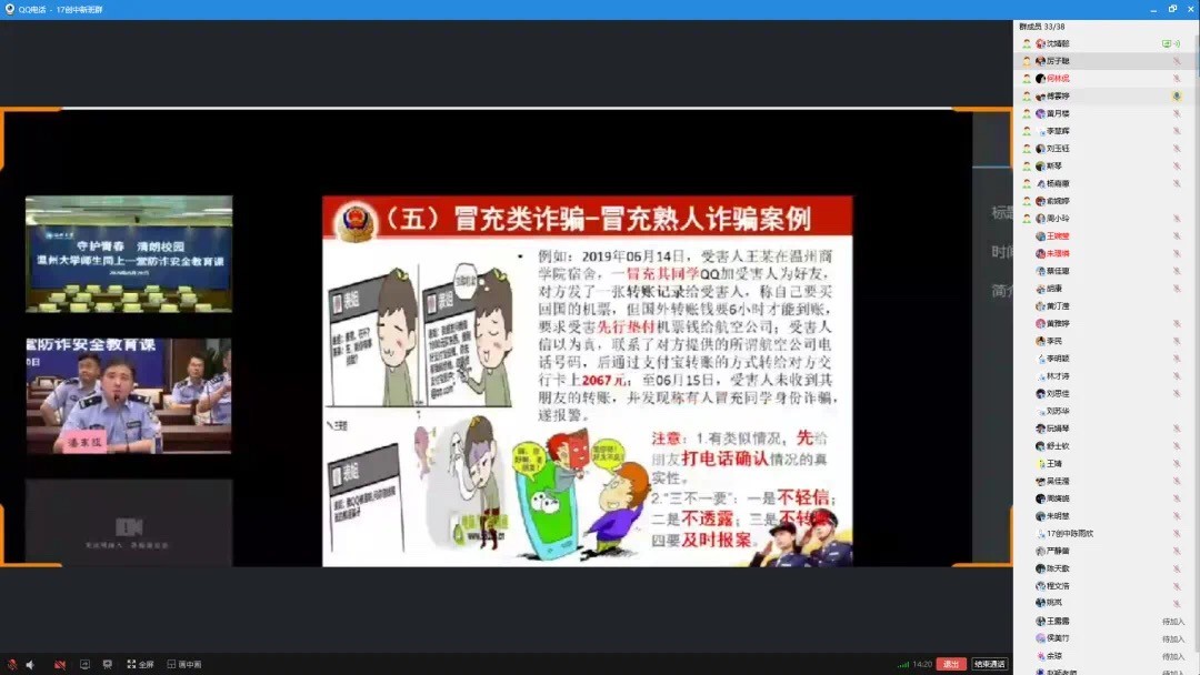 为切实加强师生防范电信网络诈骗的意识,增强学生遇到诈骗现象灵活应对的防范意识,提高学生面对安全风险时自我预防、自我保护、自我应对的能力,共筑校园安全防线,全讯白菜网官网于2020年5月20日18:30积极参与了“同上一堂反诈安全教育课” 线上活动。