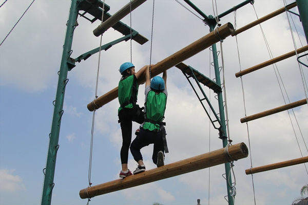 午饭后,经短暂小憩,第二个项目也接踵而至——爬天梯。同学们需两两组队,爬上由六根木桩构成的摇摆不定的天梯,这需要挑战者的智慧与默契,更需要“拉绳者”的配合,而这,便是今天活动教会我们的第二课——成功不是一个人的事,它是大家相互配合,共同努力的结果。