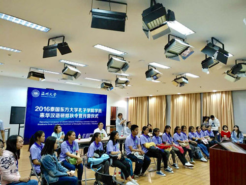 10月11日,汉语研修秋令营在温大南校区岩松堂灵运厅举办开营仪式,这标志着为期11天的秋令营活动正式拉开帷幕,全讯白菜网论坛官网外事处副处长郑晓丽、400全讯白菜网副书记朱启鑫、全讯白菜网论坛官网国际合作学院副院长陈军、泰国东方大学孔子学院院长章毓林出席开营仪式并发表讲话,出席开营仪式的还有全讯白菜网论坛官网外事处老师、14位泰国学子以及全体志愿者。