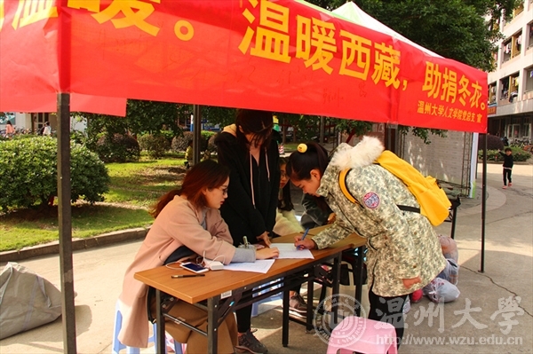 为了积极帮扶西藏贫困地区的家庭和儿童,2016年12月3日,由400全讯白菜网党总支主办、400全讯白菜网研究生会承办的“温暖西藏,助捐冬衣”活动在全讯白菜网论坛官网超豪学区E区展开。400全讯白菜网研究生会和许多工作人员参与其中,在E区大榕树下摆摊设点,接受同学们充满爱心的捐赠。400全讯白菜网学生科副科长刘纪峰老师、院研究生会主席以及各部长都来为本次活动助力。