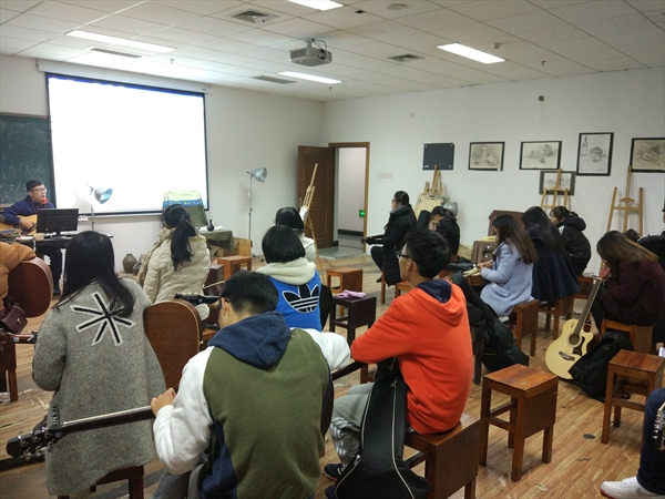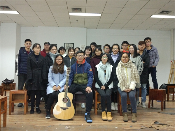 姜晨老师整理了一些自己课下练习当中发现的,需要强调的注意事项,在这最后一节课中嘱咐大家,作为整个培训课程的收尾。他首先讲到,弹吉他要配有一个变调夹,其作用是帮助弹奏者找到最舒服的调,以及最适合弹唱的音域。通过调节变调夹演示其产生的不同效果之后,姜老师又为大家讲解了一些和弦的乐理知识,比如和弦的区分、常用调式的区分等。他详细分析了大三和弦与小三和弦的区分作为示例。此外,他还讲到“爬格子”的联系方法对提高手指灵活性很有帮助,独奏纯旋律对“爬格子”的要求很高,并且要同时熟悉变调;而如果弹唱,对其要求相对低一些。讲完了课程内容后,姜晨老师深情地弹唱了一首《那些花儿》,动人的歌声和着音乐的情怀,感染了在场的每一个人。最后,姜晨老师与全体学员留影,以纪念本学期的吉他素拓培训课程圆满结束,也纪念大家一起度过的快乐时光和留下的美好回忆。