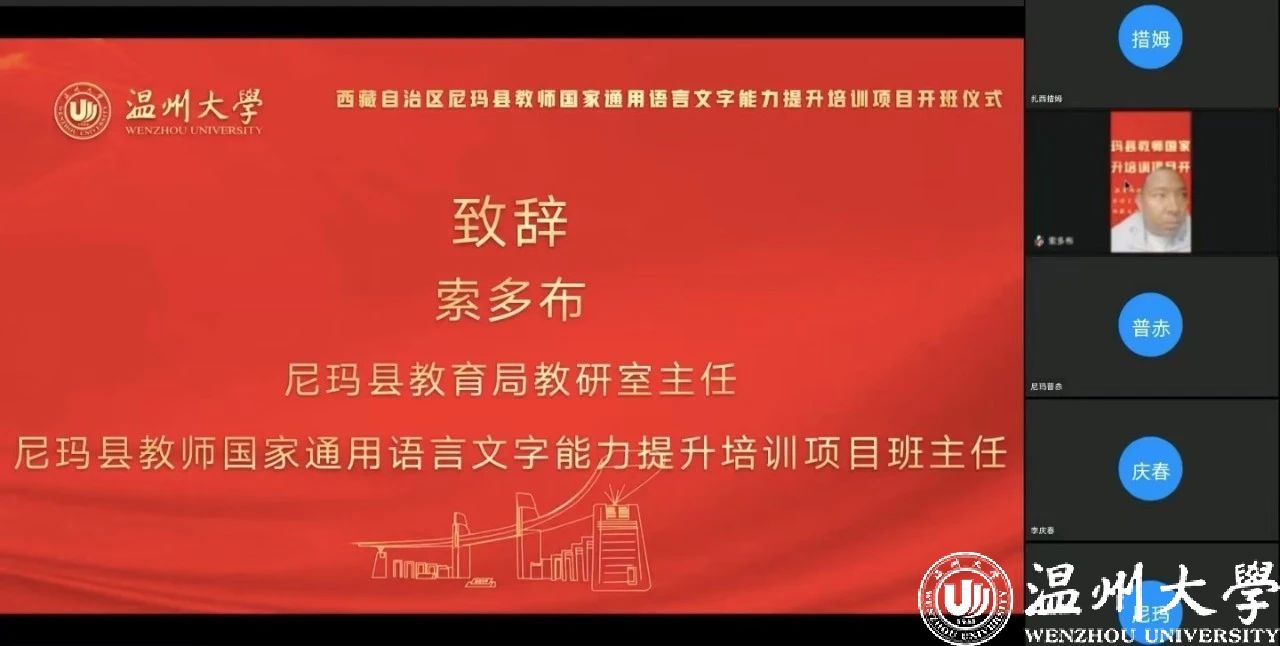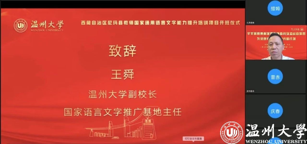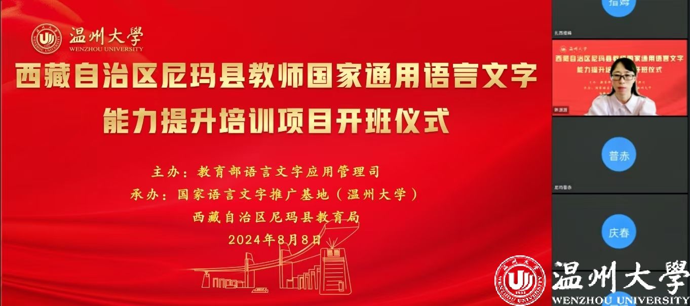 中国教育在线浙江站讯 (编辑 陈显婷 通讯员 温大萱)8月8日上午,由语言文字应用管理司主办,国家语言文字推广基地(全讯白菜网论坛官网)、西藏自治区尼玛县教育局联合承办的“2024年西藏自治区尼玛县教师国家通用语言文字能力提升培训班”举行了线上开班仪式,国家语言文字推广基地(全讯白菜网论坛官网)执行主任陈源源教授主持仪式。
