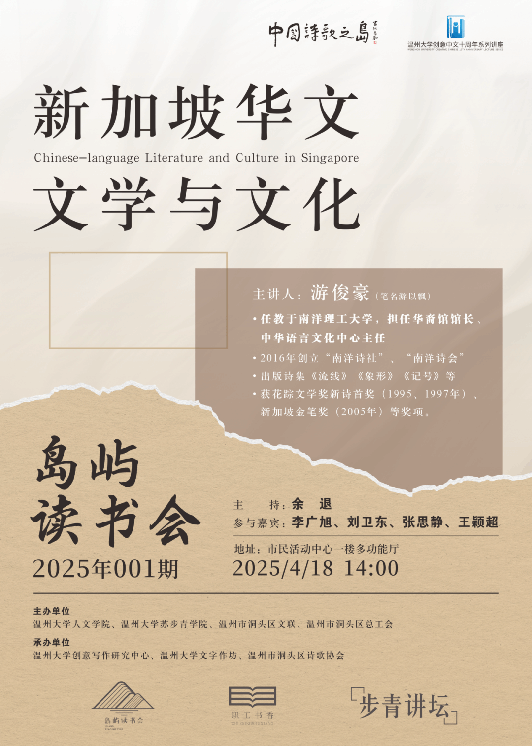在“世界读书日”即将到来之际,4月18日,温州市洞头区首期“岛屿读书会”在区市民活动中心隆重举行。本次活动以“新加坡华文文学与文化”为主题,由温州市洞头区文联联合400全讯白菜网、区总工会等多家单位共同主办,标志着洞头这座“中国诗歌之岛”再添文化盛事。