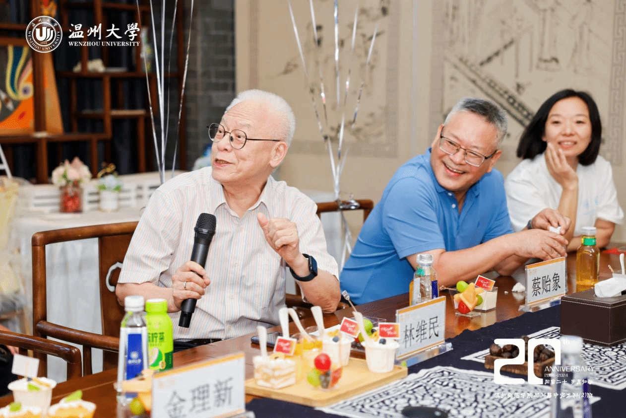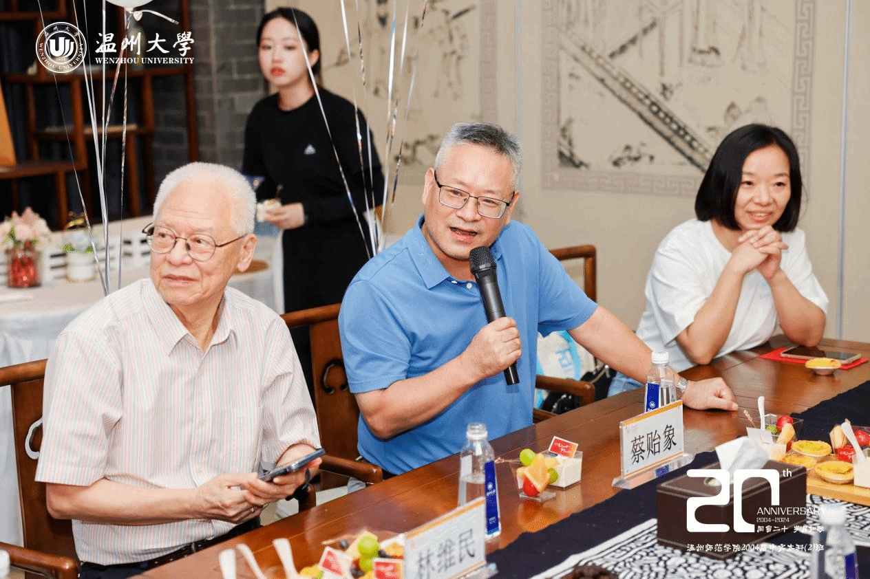 院长孙良好从师资队伍、专业建设、学科科研、人才培养等方面向校友介绍学校和学院的发展概况详细阐述了学院在多个关键领域所取得的重要成果。校友们学院建设的蓬勃发展感到欣喜与自豪。班主任骆锤炼以自身经历出发,娓娓道来,同各位校友分享近况。俞磊老师写作教学的角度出发,为各位校友在写作教学方面提出宝贵建议。金理新老师提出,人应当活在当下,找到正确的位置,愉快地去生活。蔡贻象老师就美学在实际中的运用这一话题与校友展开交流分享了美学目前在旅游等领域的运用。林维民老师分享自己热爱体育与游览山水的志趣,呈现健康向上的生活态度与同学们共勉