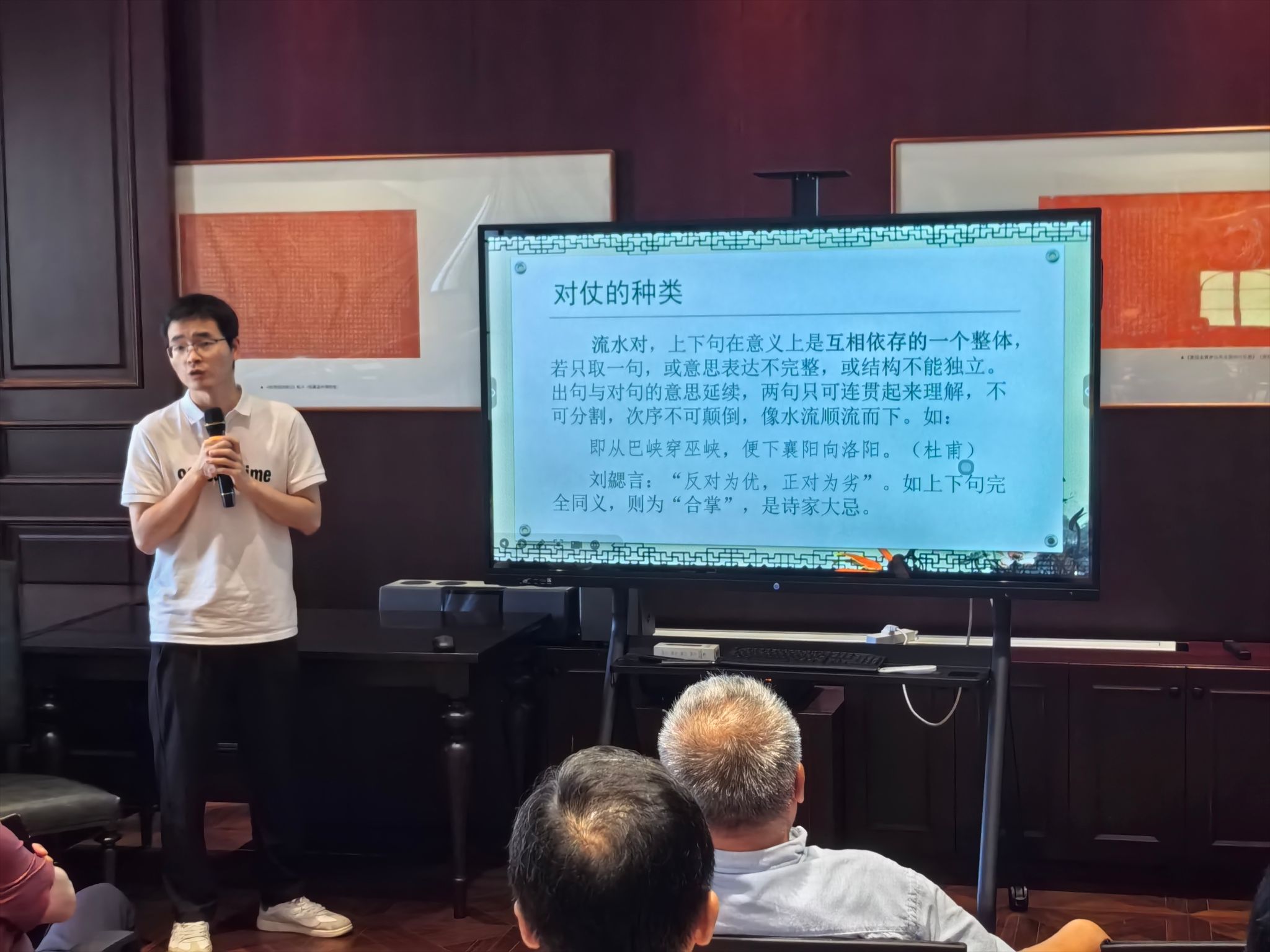 本次活动还特邀了400全讯白菜网讲师王朋飞作《对仗知识与技巧》专题讲座。王老师从对仗的源流、词类、种类及避忌等方面展开讲解,结合实例提出在诗词楹联创作中如何追求工整严谨、加强语法逻辑等建议,让校友们受益匪浅。